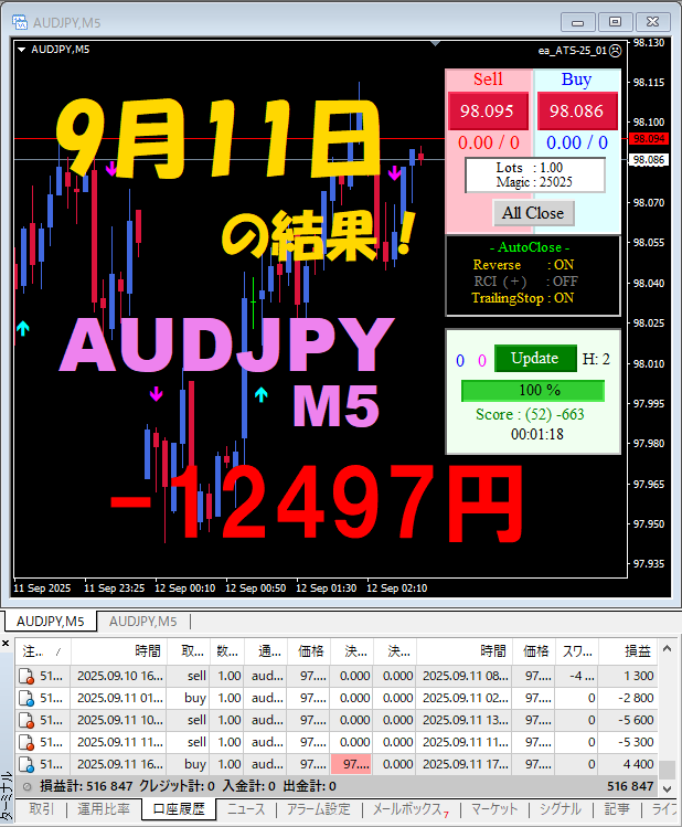 【前日の結果】AUDJPY M5 『ATS-25』09月11日、09月12日