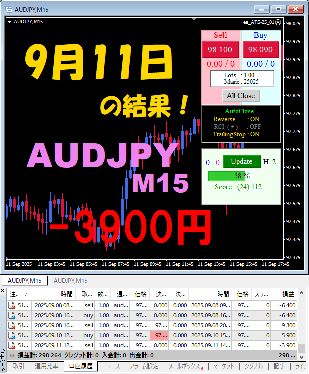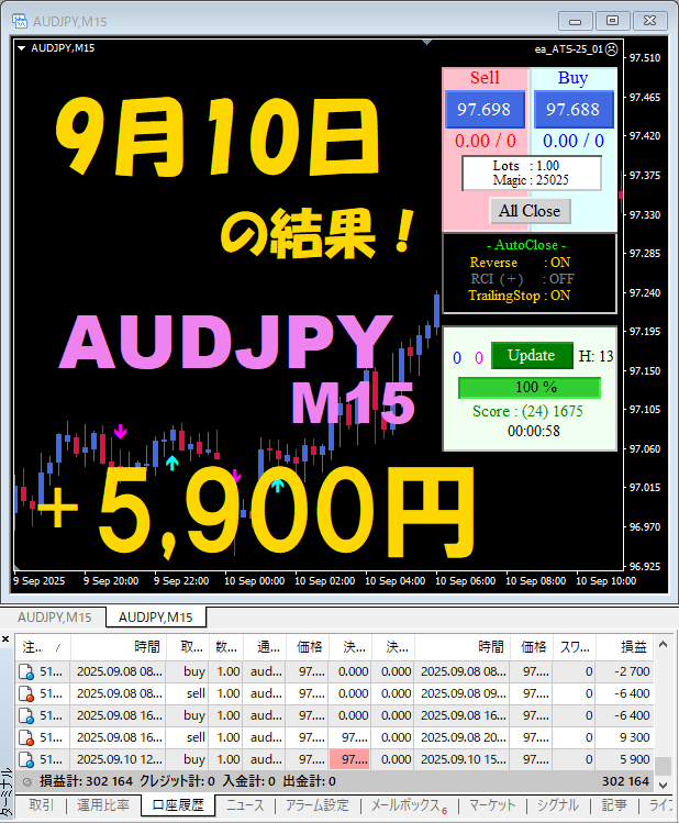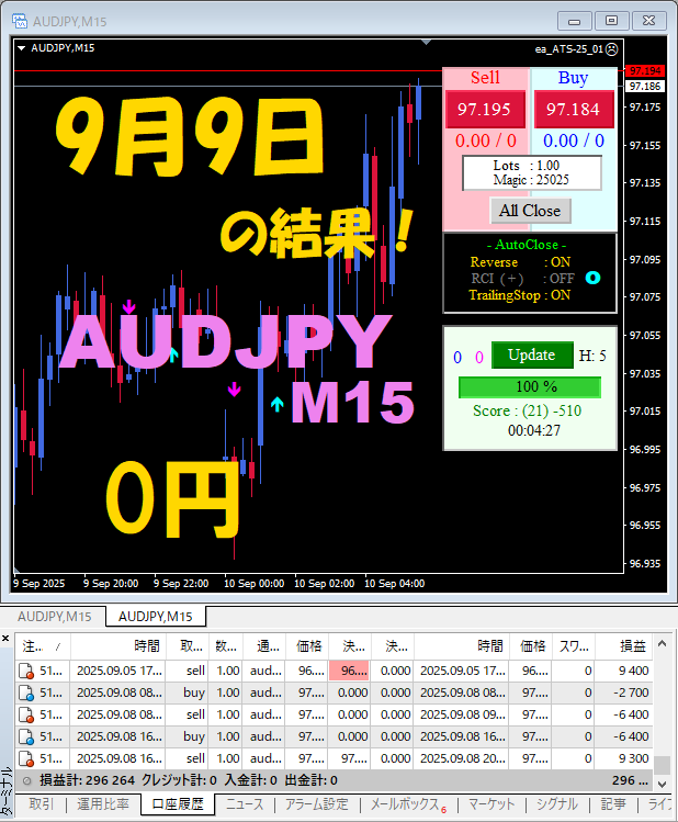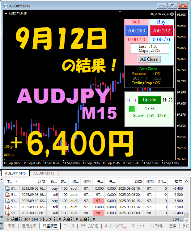 【AUDJPY M15】前日の結果『ATS-25』 9月9日、9月10日、9月11日、9月12日