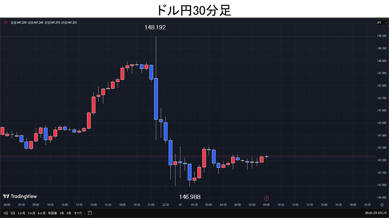 東京時間、ドル円は147.40円を挟む小動き。15時前に「高市氏が自民党総裁選への出馬意向を岸田前首相に伝達」とのヘッドラインニュースがでると、ドル円は147.79円まで上昇。欧州時間、日銀の利上げ否定派である高市氏が総裁選に出馬するとのことで、ドル円は147.83円まで上昇。NY時間、8月米CPI(消費者物価指数)は概ね市場予想通りの結果(前月比で予想0.3%に対して0.4%・前年同月比で予想2.9%に対し2.9%・コア指数前月比予想0.3%に対し0.3%・前年同月比予想3.1%に対し3.1%)となると、発表直後ドル円は買いで反応し一時148.19円まで上昇。しかし、その後は、前週分の米新規失業保険申請件数が悪化した事や米10年債利回りの低下を受け、146.98円まで下落。