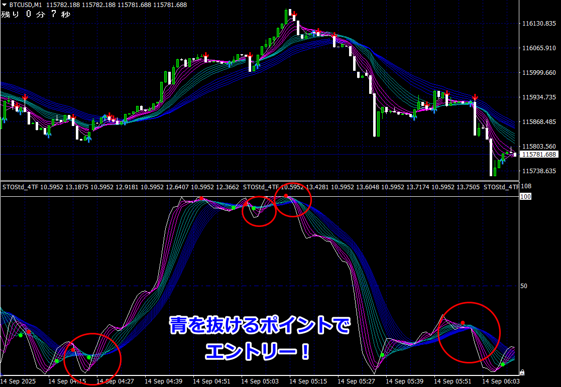 インジケーターの帯はピンク・緑・青の3層構造で、3層の帯は、収斂と拡散を繰り返しますので、 上昇時は、上から ピンク・緑・青 の並びとなり、下落時は、その逆で、上から青・緑・ピンクの並びになります。