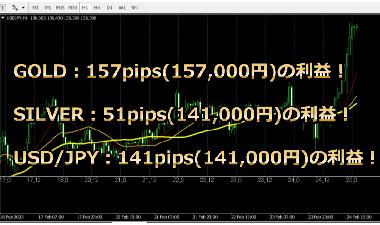 USD/JPYで、1日で141pips(141,000円)の利益を獲得!FX専業を目指せる秘手法の分析結果を配信。【2023/2/24】