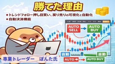 【無料特典付】勝てた理由はトレンドフォロー押し目買い、戻り売りの可視化と自動化、自動決済機能【ぽんた氏】Vol.1