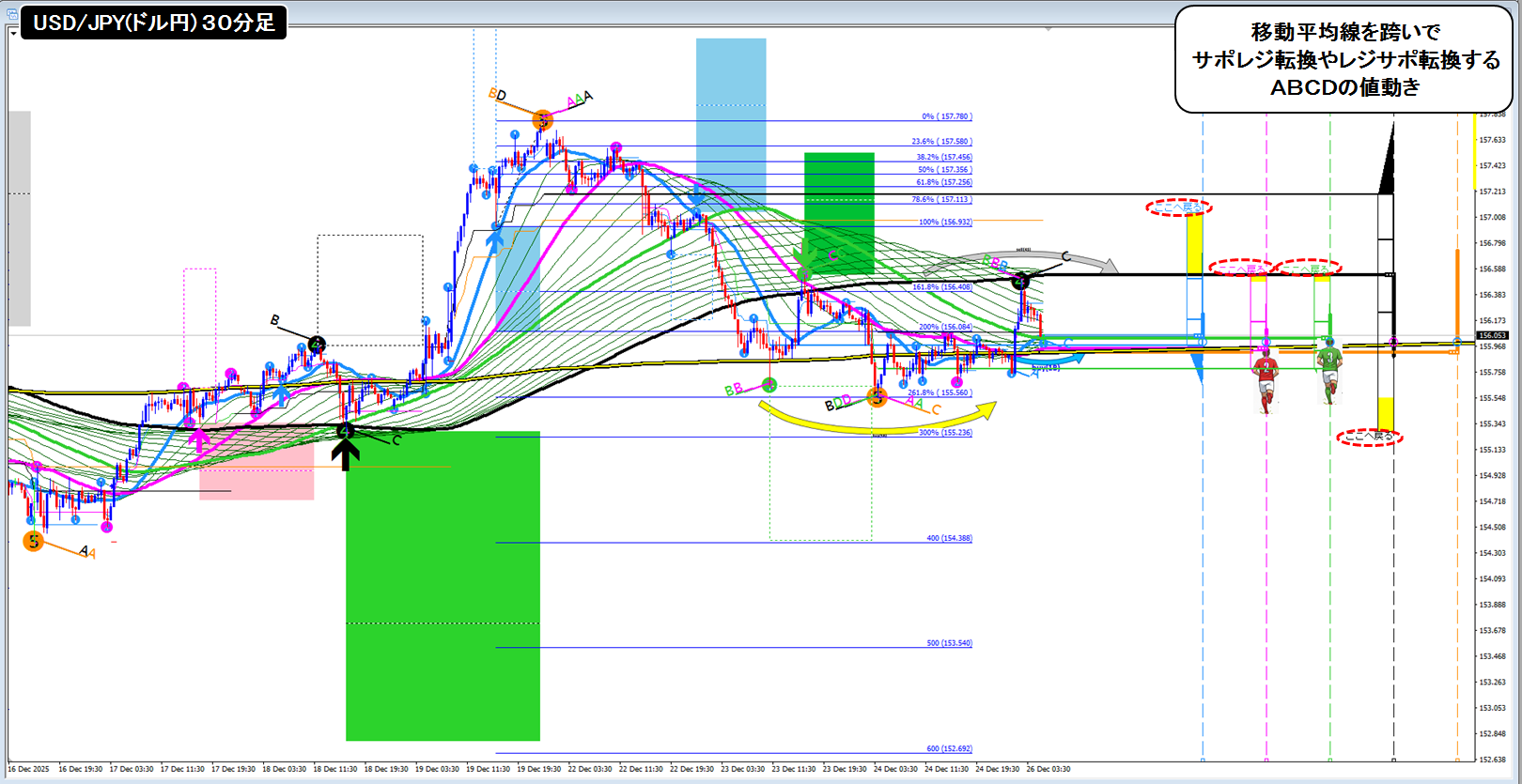 クリスマス後の現在のドル円(30分足)チャートを用いて、大中小の移動平均線(20/50/100/200/400SMA)でのサポレジ転換やレジサポ転換の状況をそれぞれ順に見てみます。 青①20SMA移動平均線でのサポレジ転換/レジサポ転換の状況 ●安値Aから青20SMA移動平均線を上抜き高値B...