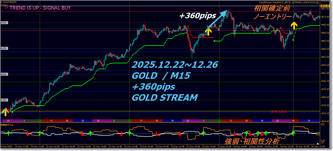 ▼【先週の成績】 ”GOLD STREAM” 2025.12.22~12.26(MAX計算)▼GOLD 価格動向(12/22〜12/26) 金価格はこの週に急上昇の展開。12月22日には1トロイオンス ≈ $4,434〜$4,441付近で前年最高値を更新する動きが見...