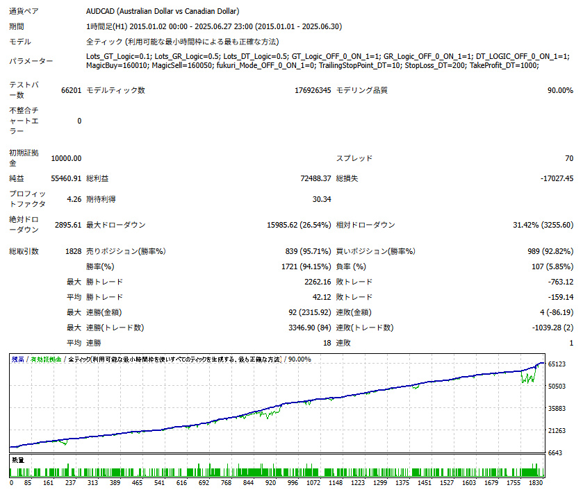 バックテストを7Pips(70ポイント)と、かなり厳しい条件で行いました。甘めのテストで成績を良く見せる事をせず。悪条件下でも、実運用でしっかりと利益が出る様に設計しました