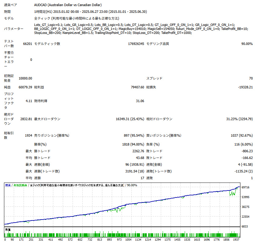 バックテストを7Pips(70ポイント)と、かなり厳しい条件で行いました。甘めのテストで成績を良く見せる事をせず。悪条件下でも、実運用でしっかりと利益が出る様に設計しました
