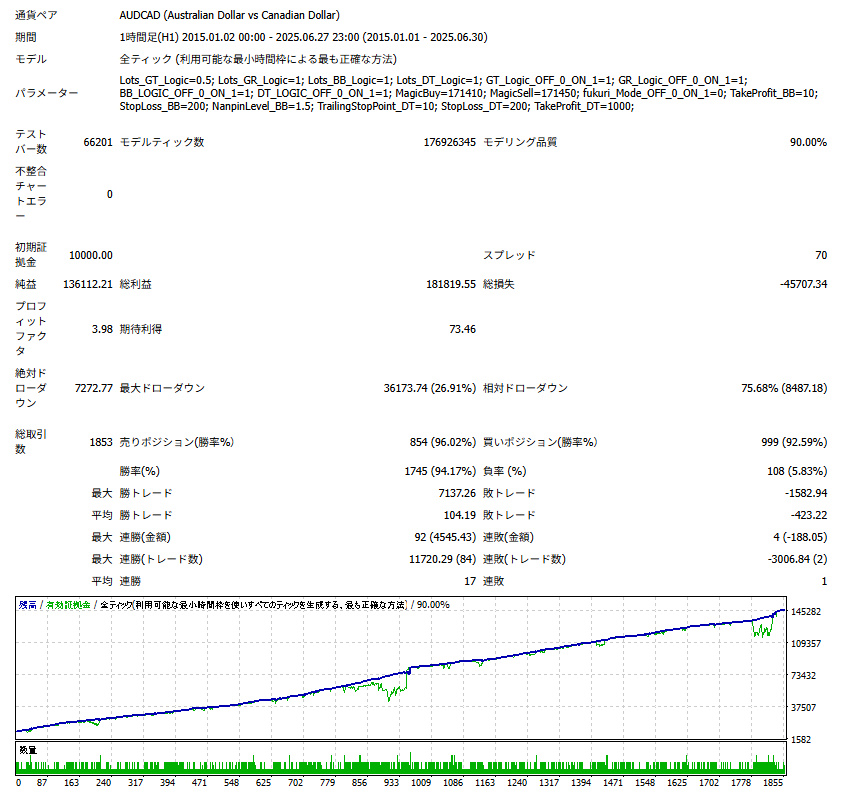 - 総取引数2,056回に対し、勝率は94.31%と非常に高く、ほとんどの取引が利益で終了していることが分かります。