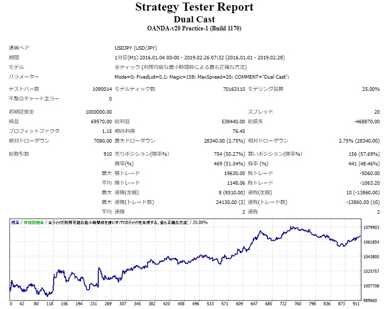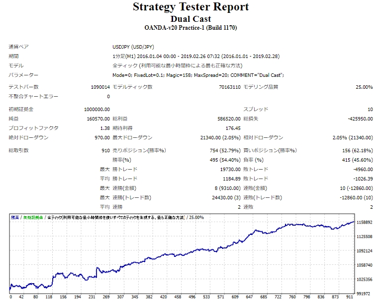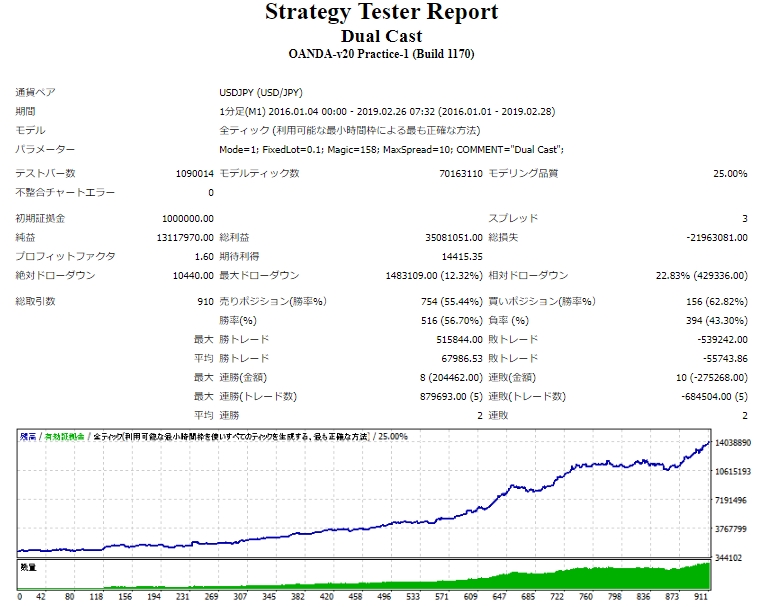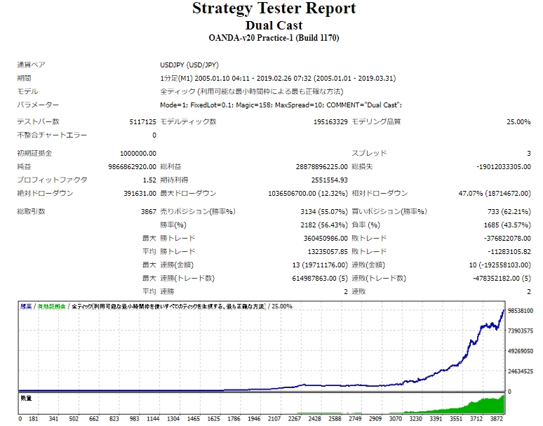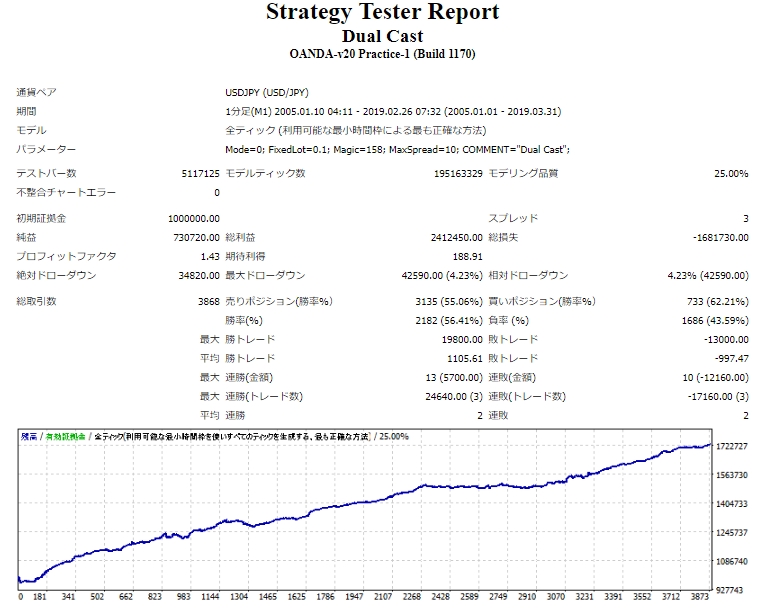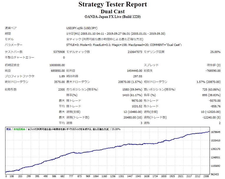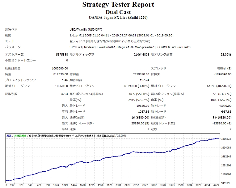 損小利大のEAは普通は勝率が50%を切るものが多いですが、「デュアル・キャスト」は勝率56.39%(NEWモードは61.17%)という、本来クリアが難しい50%のラインを大きくクリア。 特徴②【安心安全のワンポジション型】 複数のポジションを持つEAの場合、ポジションをいくつ持つかの予測がつきにくいため、自分が投資したい金額にロットコントロールすることが非常に難しくなります。 また、多くのポジションを持った状態で相場が逆方向に進んで大量の含み損を抱えてしまうという恐れがあり、大きなストレスを感じてしまうこともよくあります。 「デュアル・キャスト」は複数ポジションを持たない「ワンポジション型」のEAのため、投資金額のコントロールがやりやすく、また大量の含み損を抱えてのストレスフルな時間を持つことがありません。 特徴③【たくさんのエントリー回数】 週に1回や月に2・3回といったエントリー頻度が少ないEAの場合、投資家としてはやはり物足りなさを感じてしまう方もいると思います。 「デュアル・キャスト」は月曜日から金曜日まで、毎日ほぼ100%エントリー。高い勝率、高い利益率をもとに高頻度でポジションを持ちますので、多くの利益を生み出すことが可能となっています。 (現在コロナ相場で証券会社のスプレッドが上がっているためフォワードテストでエントリーしていない日がありますが、許容スプレッドの設定を上げれば祝日以外は毎日エントリーします) (バージョンアップで追加された新モード選択時は2日に一回くらいのエントリー頻度になります) 特徴④【高いスプレッド耐性】 リアル口座では様々な不利な要素があるので、高いスプレッド耐性が必要になります。つまり手数料が高くても利益が出せる必要があるということです。 「デュアル・キャスト」は20ポイントというとんでもなく高いスプレッドでも利益が出るように調整。スプレッド負けで利益が出ないということが起きにくいようにしています。(2016年~2019年) 特徴⑤【複利運用管理システム「Eighty System」】 「Eighty System」は、トレーダーのトレード法をもとに構築された運用管理システムです。複利での運用管理を自動で行い、ロット調整を適切におこなっていきます。 特徴⑥【10年以上通用するロジック】 「Iデュアル・キャスト」は14年以上という長い期間のバックテストでも、安定して右肩上がりで伸びていきます。