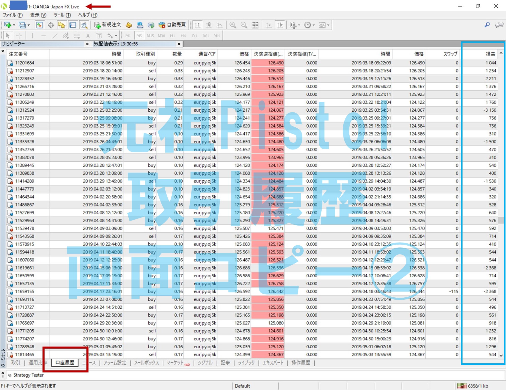 ・2019年6月6日 Ver1.0正式発売 ・2019年6月27日 Ver1.1アップデート(変更点:スキャルピング式のトレーリングストップ変更オーダーが拒否された場合、ポジションクローズ命令を追加しました。) ・2019年7月1日 Ver1.2アップデート(変更点:月曜日フィルター追加。) Monday_Trade【Trade/Stop】 Trade:月曜日取引有効 Stop:月曜日取引しない ・2019年7月16日 Ver1.3アップデート(変更点:時間制限決済機能追加) ・2019年7月21日 Ver2.0アップデート 変更点①:援軍要請--売買ロジックの新規追加 変更点②:パトロール隊の強化--既存ロジック条件より厳密に。REAL TRADE
