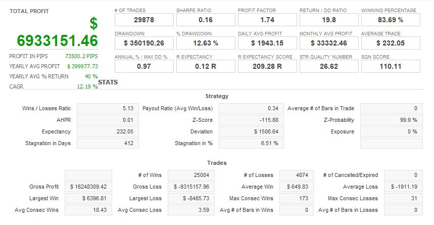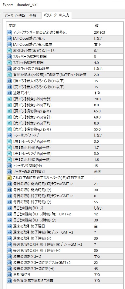 バックテスト条件の0.1lot、最大ポジション15、ストップ80では、最大で12万円のストップロスが発生します。 資金量を考慮のうえで、余裕をもったlot数、最大ポジション数でご利用下さい。
