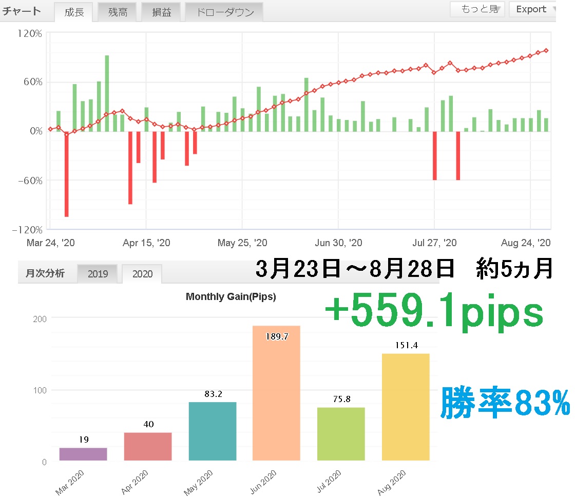 最大SLは45pipsでTP値は上限無く特殊な計算式により算出された変動値がエントリー毎に設定され決済は内部ロジックが機能することで平均獲得が約15pips:平均損失が約35pipsとなり勝率は約80%となります。