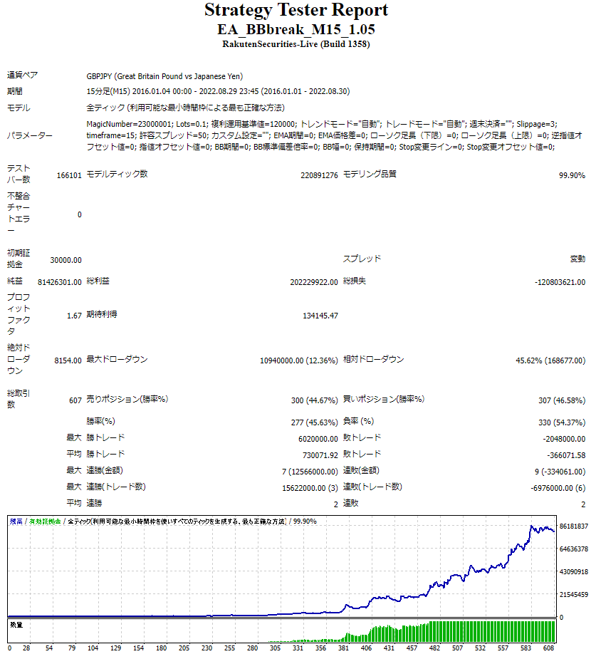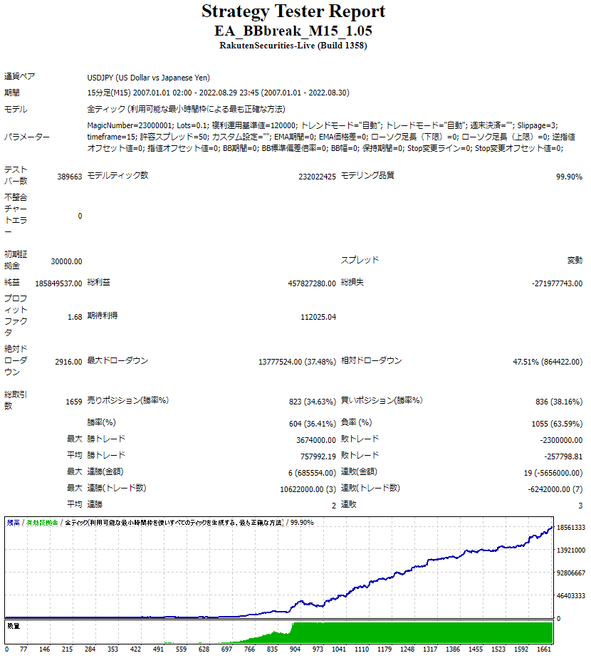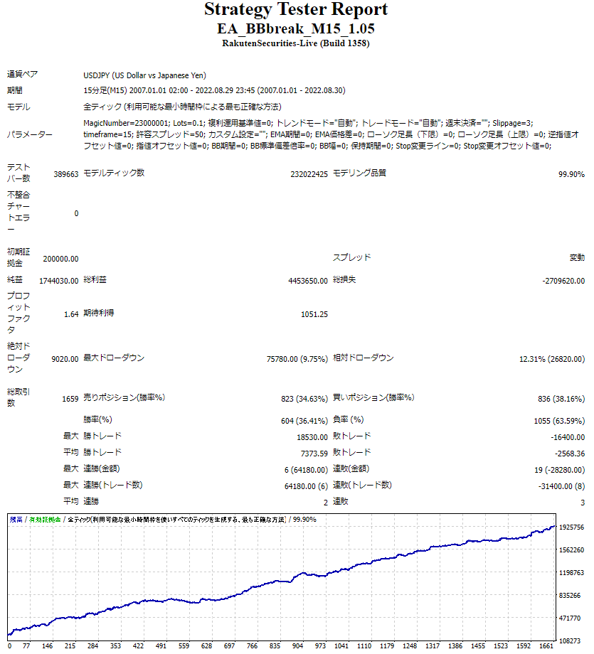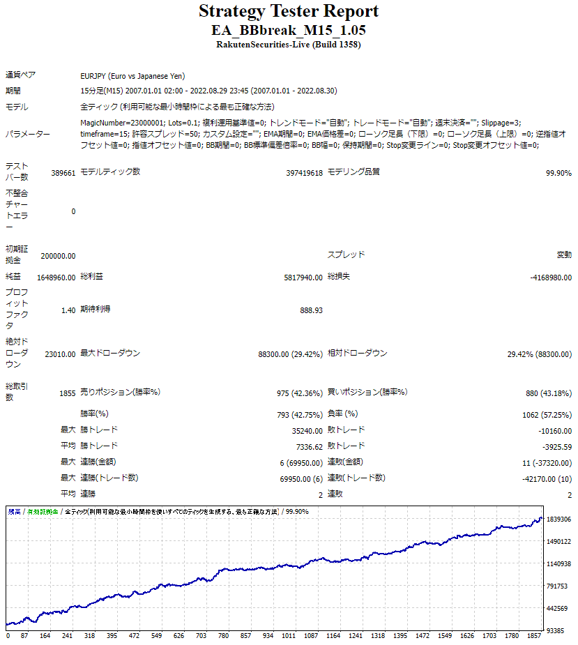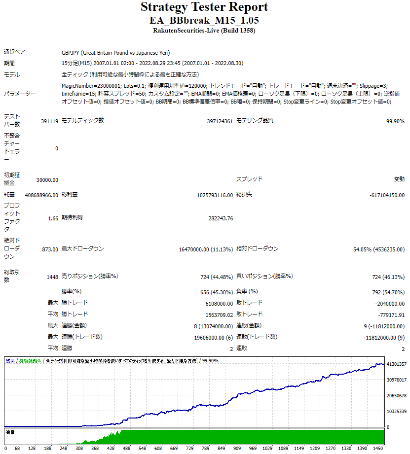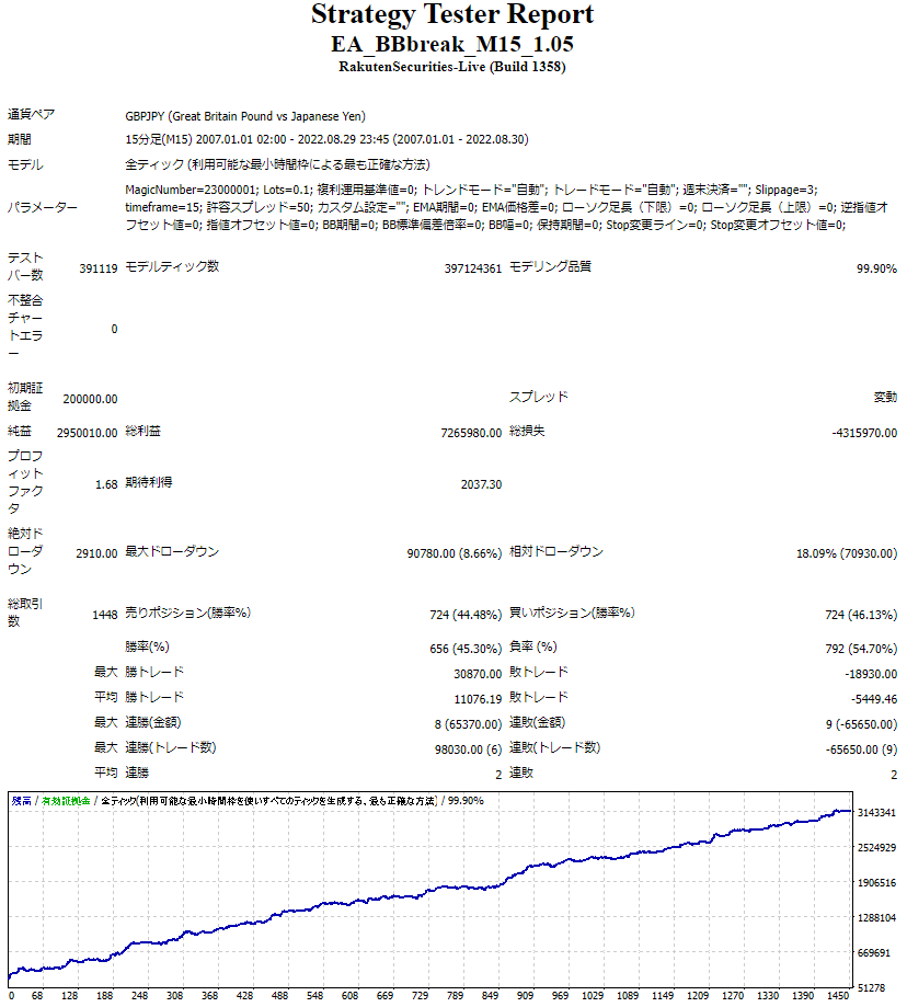 GBPJPYでの1万通貨固定(1ポジションのみ、複利運用なし、スプレッド20)で、2007/01/01~2022/08/31で実施したテスト結果は以下です。