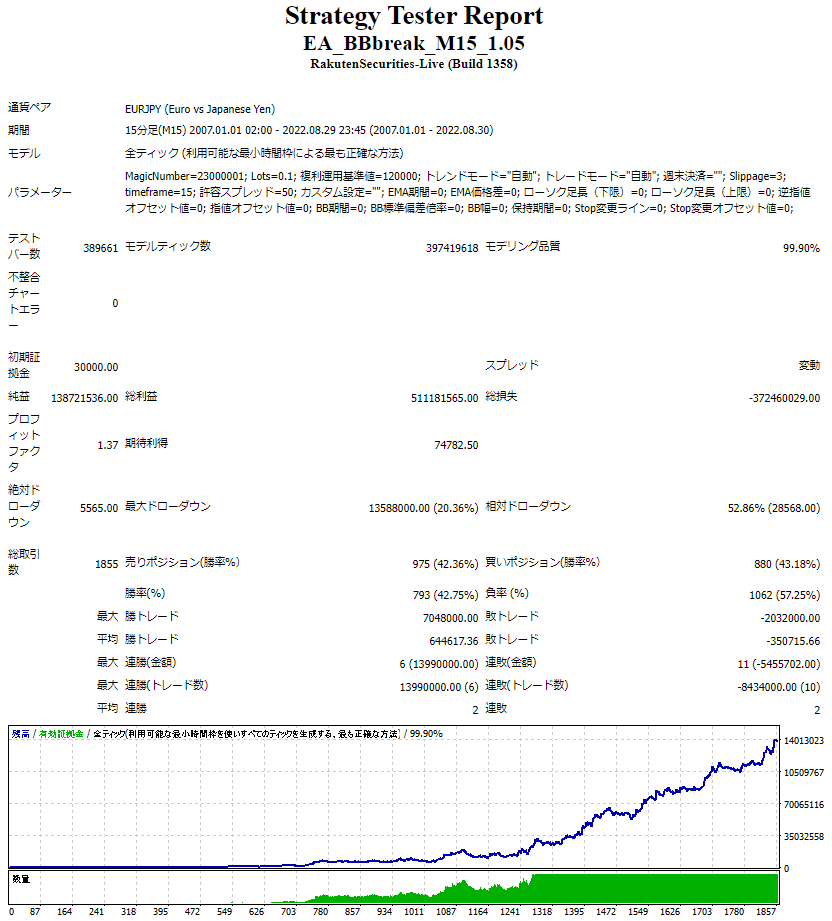 こちらのブログ記事「BB break M15のフォワードテスト(デモトレード運用)結果を分析する」でフォワードテストの結果を分析中ですので、併せてご確認頂けたらと思います。