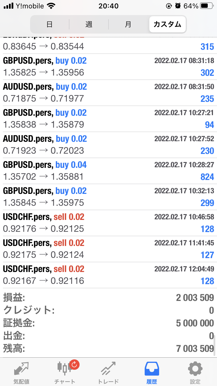 ⇒ 最大DDと最大含み損は、違いますので気を付けてください。重要なのは最大含み損です。最大DDはもっと少ない数値となりますので皆さん騙されます。含み損は、問合せいただければと思いますが、開始のタイミングで違いますし、聞いてどうなるものではありませんが、フォワード現在(2022.2.11)は、初期設定では最大含み損は32.6万となっております。ただし、今後の相場の保証はなく、投資に100%はありませんのでご理解お願いいたします。