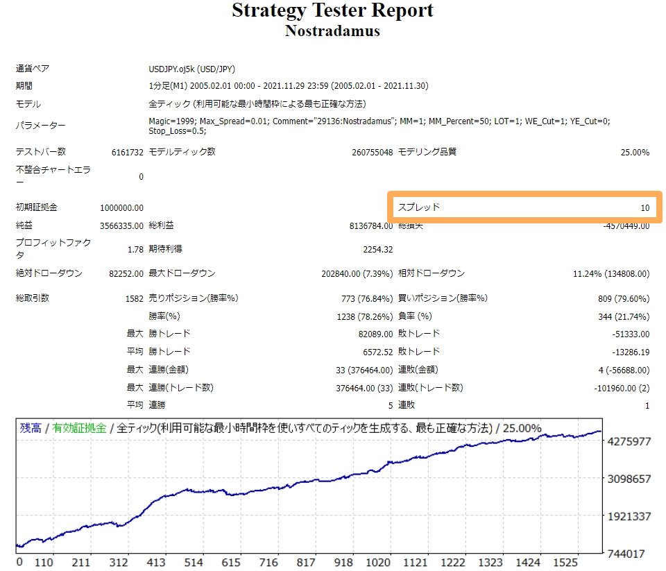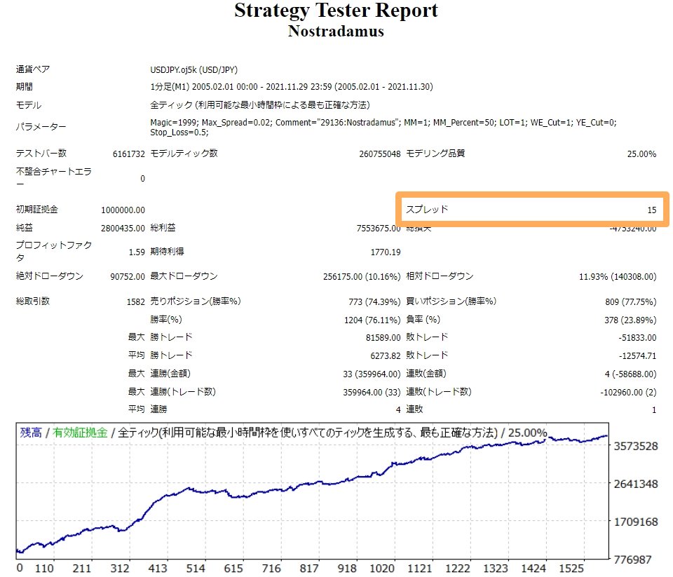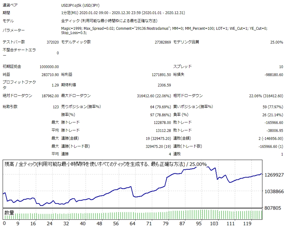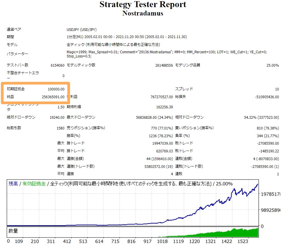 複利運用では運用ロットがどんどん大きくなっていく分、負けたときの損失も比例して大きくなります。 そのためできるだけ負け金額が少なく済む設計であることが重要で、この点ノストラダムスの小預言は非常に相性が良い設計となっています。