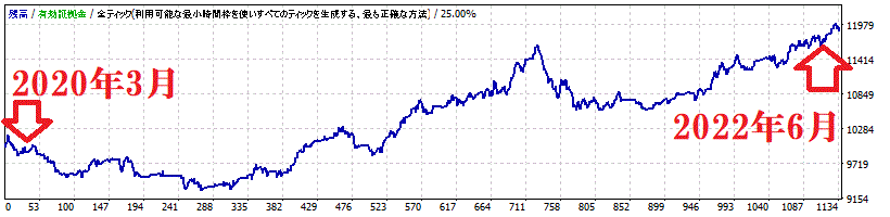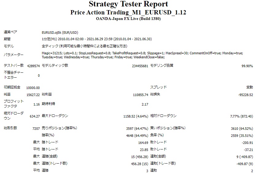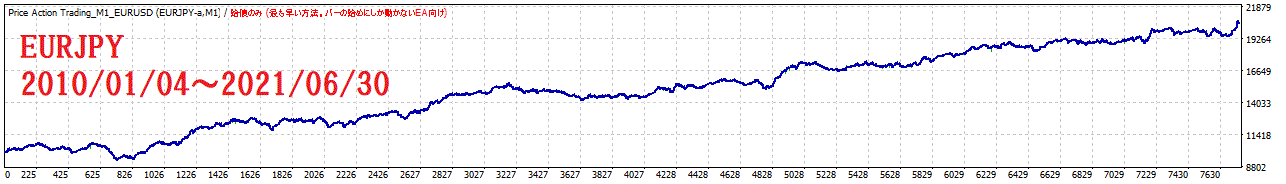 【バージョンアップ履歴】 バージョン1.01(2021.7.20) 1、週末クローズ設定の追加(プロパティで週末に強制決済するtrue しないfalse) 金曜日の22:40~(夏時間)23:40~(冬時間)にポジションを強制決済します。 2、通貨ペアに合わせてエントリーする時間や内部設定値を自動で最適化する機能を実装しました。 今回の修正により、プロパティからエントリーする時間を変更できなくなり、 GMT+2(冬)/+3(夏)以外のサーバーでは利用不可になりました。 3、日経平均、金、原油などのCFDに対応 4、クロス円のレート表示の微調整 5、新規エントリー回数の上限設定の追加 システムバグ等でエントリーとエグジットの無限ループが行われた際の、保護機能を実装致しました。 通常EAによる新規エントリー回数は多くても1日10回くらいです。 短時間で30回以上エントリーとエグジットが行われると保護機能が働き、それ以上新規のエントリーは行われなくなります。 手動で決済をするなどして上限に達した場合、MT4を再起動することでカウントが0にリセットされます。 プログラム内の回数リセットタイミングはサーバー時間の4:00(日本時間の10:00~11:00)と、11:00(日本時間の17:00~18:00)と、18:00(日本時間の24:00~1:00)の3回です。 6、スプレッドが広がったときに注文を出さない設定を追加しました。 許容スプレッド BidとAskの値の差を入力 例50⇒5pips デフォルト MaxSpread = 30 7、エントリーする曜日を選べるようにしました。