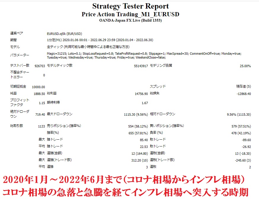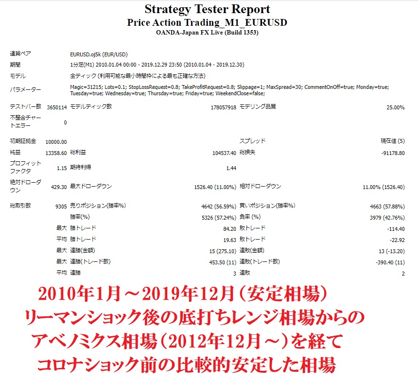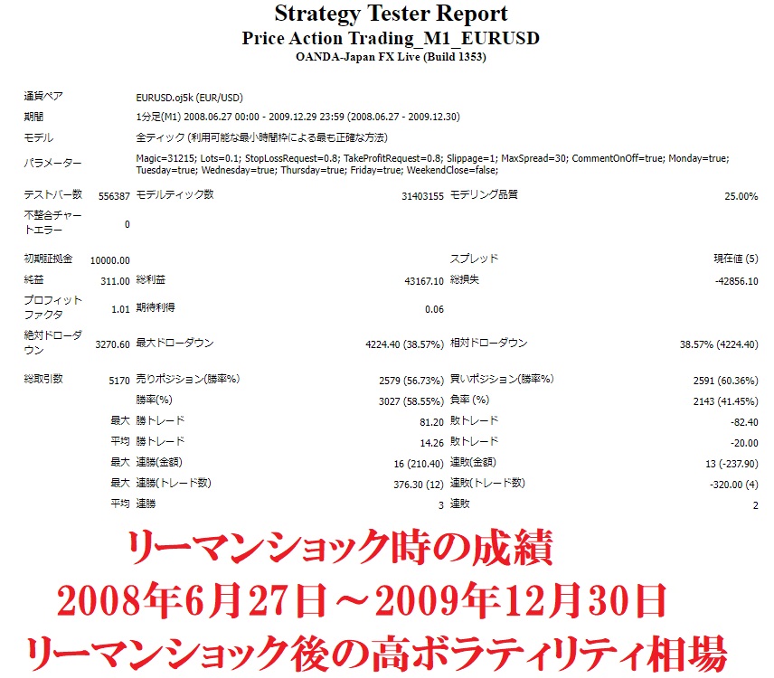 相場の急変動に対しプライスアクションでトレードする1分足専用スキャルEAです。 日本時間の早朝をメインに逆張りでトレードを行います。 年間トレード回数は「EURUSD 700回」「GBPJPY 900回」「EURJPY 500回」「USDJPY 400回」「AUDJPY 500回」 1ポジション型のEAで、両建ては行いません。 日本時間の早朝にトレードするのでスプレッドが開いている可能性があります。 必ずMaxSpreadを30(3pips)以内に設定して運用してください。 ・ストップロス設定で損失が限定されます。 ・1分足と5分足で動作しますが、1分足チャートに最適化された設定になっています。 ・他のEAとの同時稼働可能。 ・マジックナンバーは他のEAと被らないように設定してください。