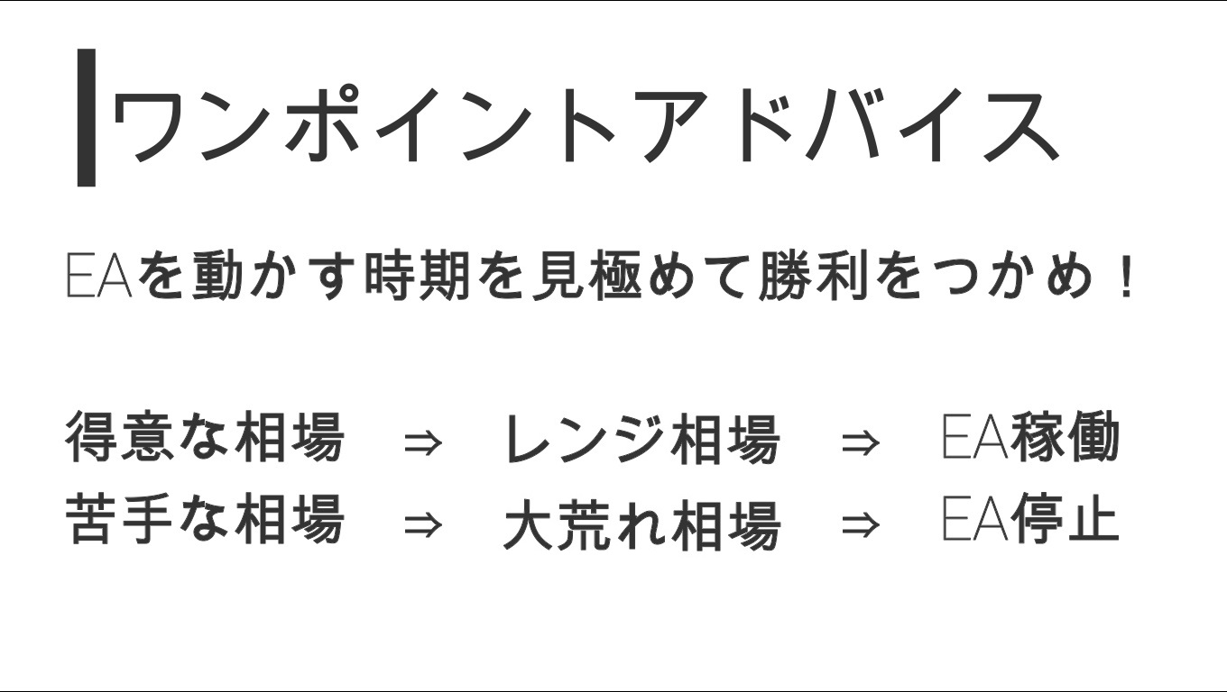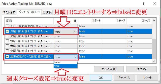 【EAオススメ設定】 デフォルトでは、月曜日の早朝にエントリーする設定となります。 また、週末持ち越しする場合があるので、リアル運用では以下の設定を推奨します。