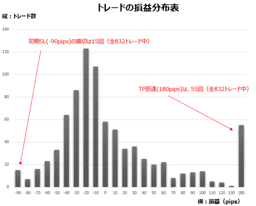 各トレードの損益を集計しました。損小利大の分布になっております。ご参考にして頂ければと思います。