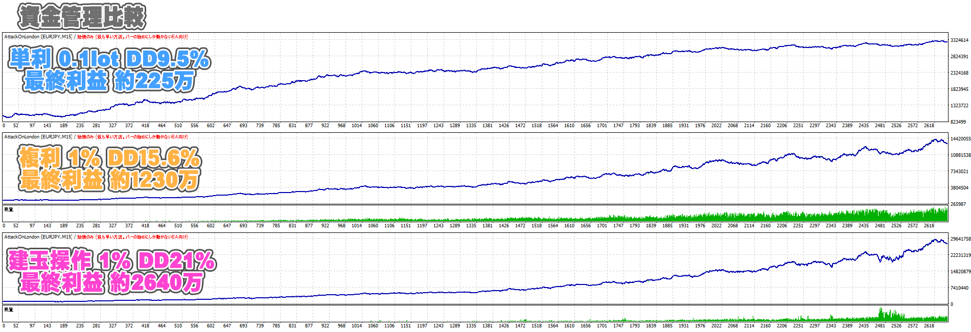 本EAは【単利】、【複利】機能の他に、一連の取引のドローダウンに応じて
