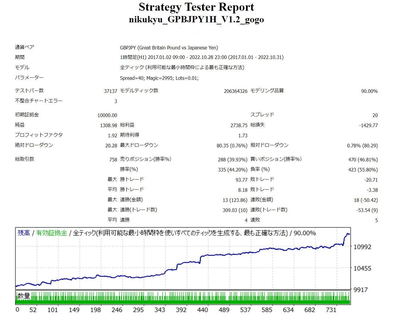 通貨ペア:GBPJPY 時間軸:1H パラメータの説明 許容スプレッド:許容スプレッドよりスプレッドが開いている場合は取引を行いません。 Magic:他のEAと被らない用設定して下さい。 Lots:初期ロット数を変更できます。