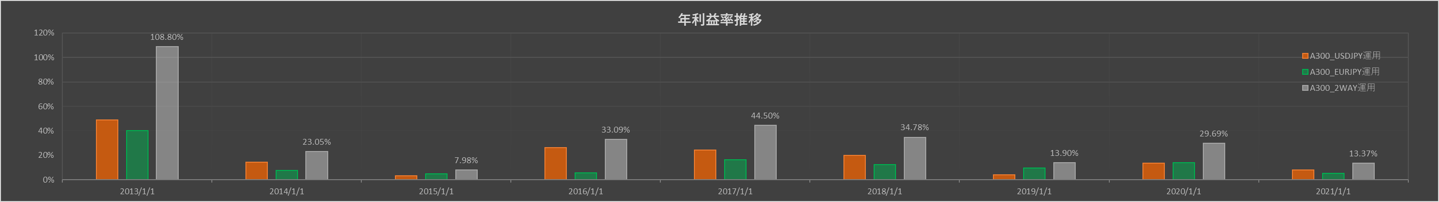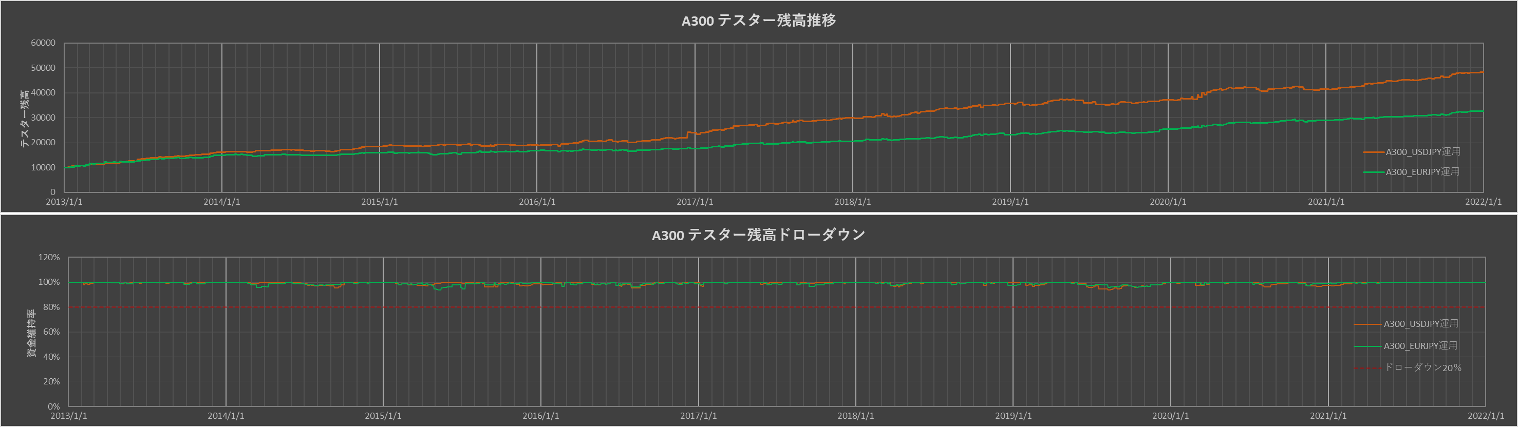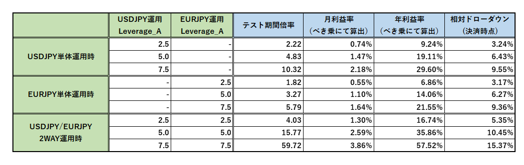 USDJPYでの運用成績の方が、EURJPYより良くなるテスト結果になっておりますが、