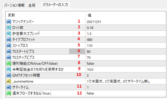 ・SL(Stop Loss):EAの設定上の最大損失pips(または指定された金額など)