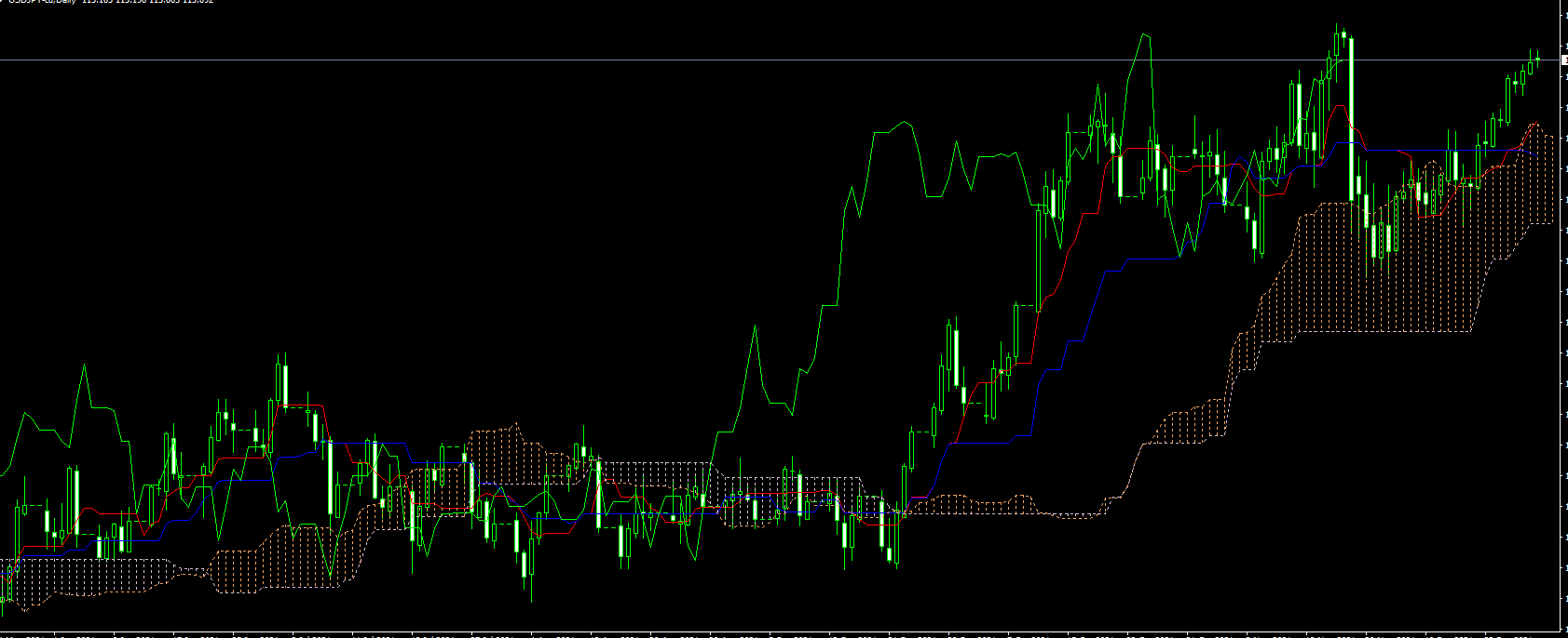 - 先行スパンB:ローソク足52本分の最高値と最安値の平均をローソク足26本分前方にシフト描画したもの
