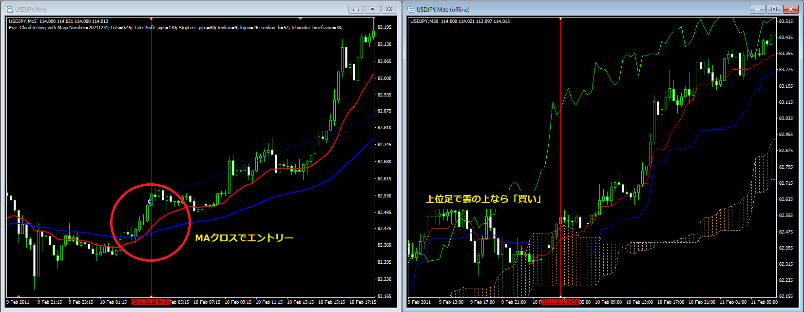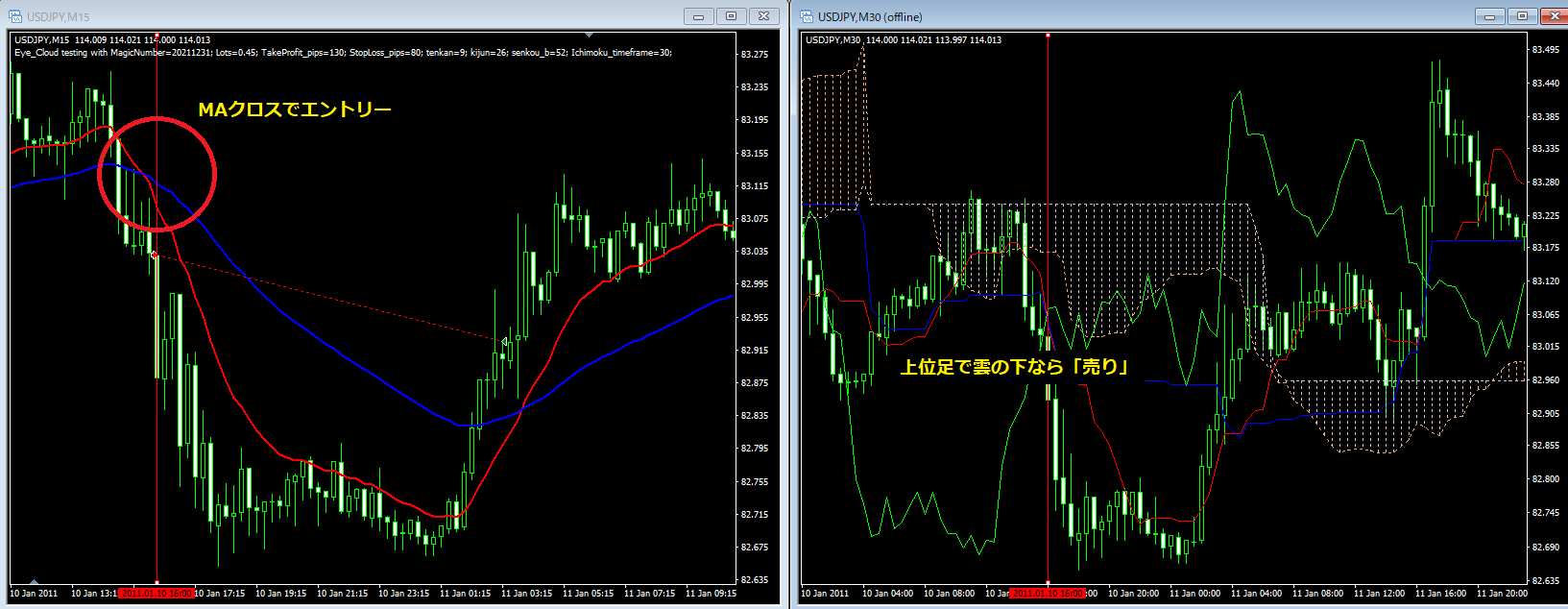 Eye_Cloudは、一目均衡表でトレンド判断を行い、移動平均線のクロスでエントリー/決済判断を行うシンプル設計のEAです。