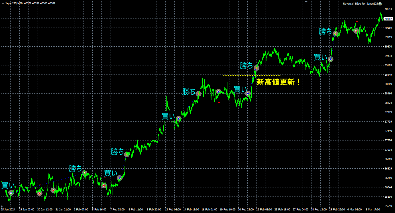 例えば、買値が 30,000円 だった場合、1.6% (480円) の上昇で利益確定します。