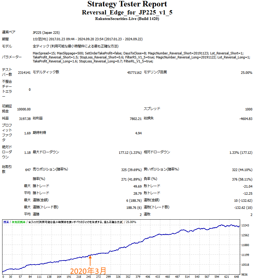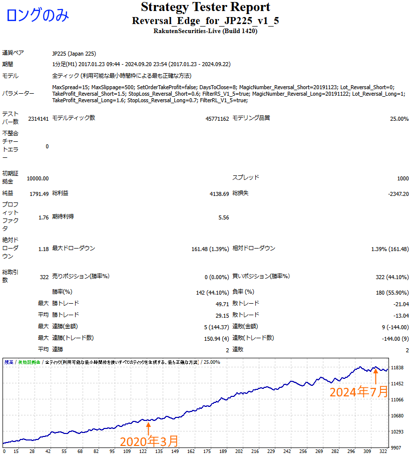 FilterRL_V1_5 (初期値 true) 逆張りロング回避のフィルターをON/OFFします。 true にしますと、取引数は減りますが、勝率アップと低ドローダウンが期待できます。 false の場合はバージョン1.4以前の設定と同じです。