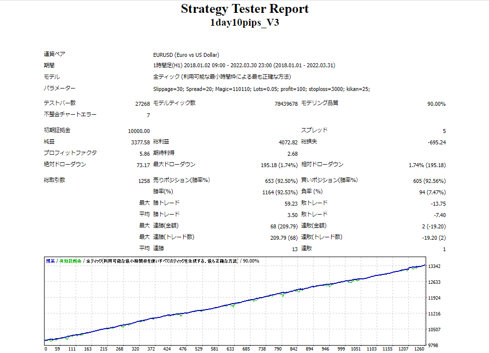 テイクプロフィットは10pips、最大ストップロスは150pipsと設定されていますが、捕まってしまった場合は内部ロジックによる損切りも行います。