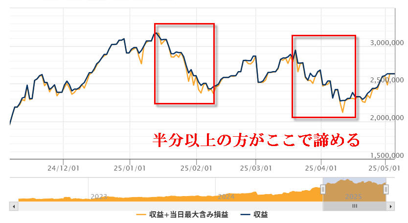 本EAの運用は投資信託と同じ、長期投資となります。状況によって数か月も利益を得られない場合もあります。十分ご理解ください。