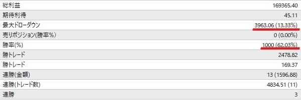 本EAでは、約19年間にもわたる長期間のバックテストであるにも関わらず、「13、33%」という大変低い数値で制御できており、リスクの低さやパフォーマンスの安定性を裏付けています。