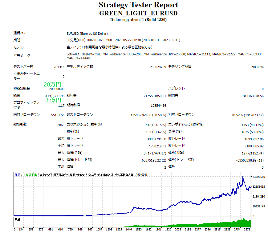 | 『UseMM』 | 複利機能。口座残高に応じてロットサイズを変更する場合『true』を選択 |