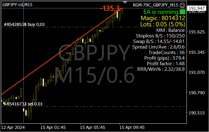 ・SL (Stop Loss): The set maximum loss pips (or specified amount, etc.) in the EA's settings