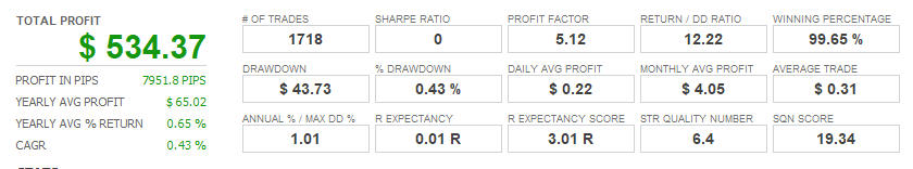 プロフィットファクターは3.25と高く、安定した収益性があります。勝率も99%と非常に高いです。