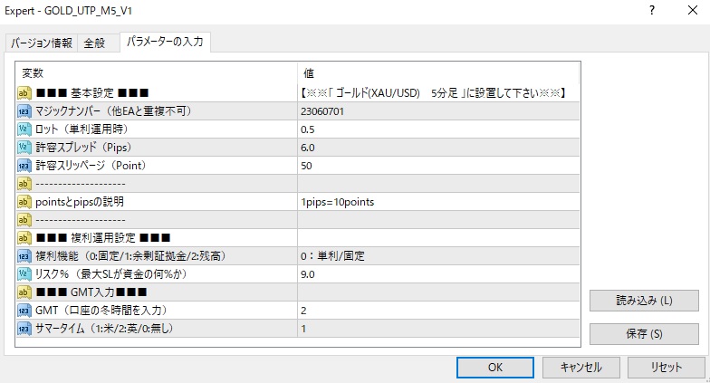 すなわち、 資金100万円の場合にはおよそ0.5ロットとなります。 最大SLは180pipsであるので この場合は9万円の損失となります。 ↓ パラメーター「リスク%」は9を入力となります。