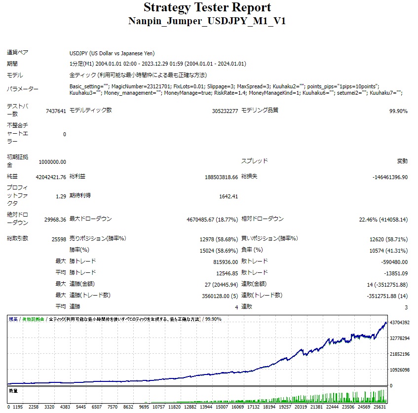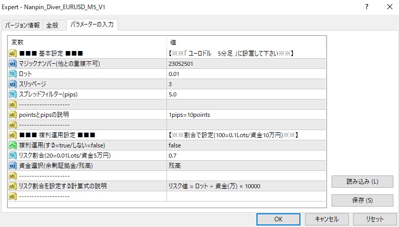 当EAは、   ●買い・売りポジション共に片側最大5ポジションまで持ちます。 ●買い・売り共に2倍のマーチンとなります。 ●最初の売りポジションが0.01ロットなら0.01,0.02,0.04,0.08,0.16となります。 ●各ポジションごとにSLが設定され損切り決済もあります。 ●損切りされた場合、次のポジションはその時に保有しているポジションの最大ロットと同じロットで入ります。 従いまして、 最初の1ポジション目のロットパラメーターを0.01ロットに設定した場合、 片側0.16ロット×5ポジション =0.8ロット入った場合を想定してリスク管理するものとします。    1ポジション目のロットが0.01ロットの時、 過去のバックテストでは最大DDはおよそ20万円弱。 この時、0.8ロットの必要証拠金は レバレッジ25倍で1ドル150円の場合  0.8ロット(8万通貨)×10000×150円÷25倍=およそ48万円。 これを足し合わせて 20万円+48万円=68万円。 レバレッジ25倍では、 0.01ロットあたり最低限70万円ほどの資金は欲しいかなという計算になります。 ●パラメーター「リスク割合」は1.4を入力