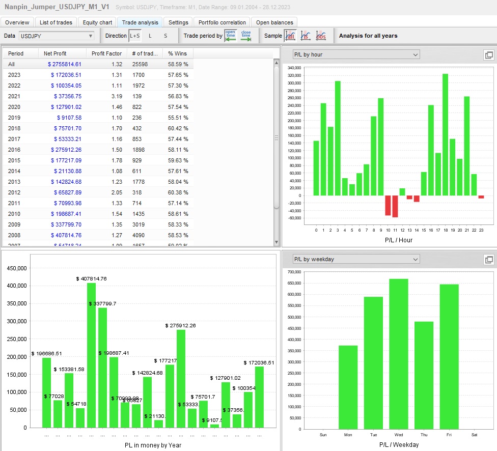 ●2004年~長期間の相場環境を網羅して右肩上がり。 ●取引回数は2万回を超えました。 ●ナンピンながらもリカバリーファクター(純益÷最大ドローダウン)は高いです。