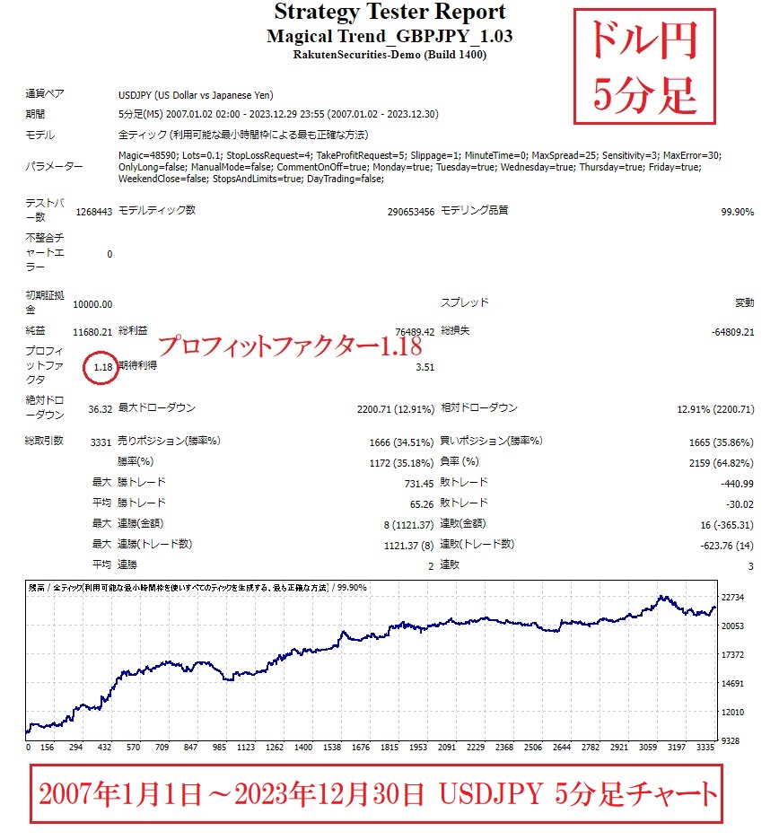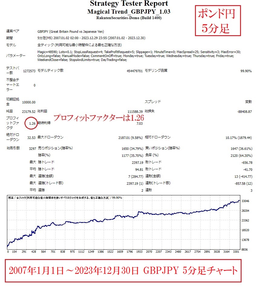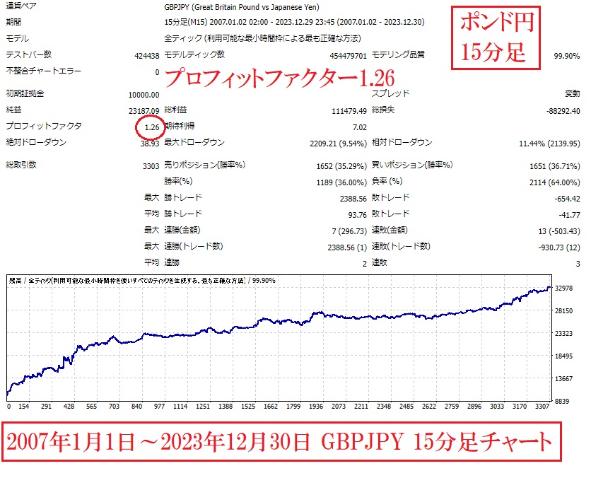 2007年1月2日~2023年12月30日のポンド円5分足チャートでのバックテスト結果では、プロフィットファクターは1.26となりました。