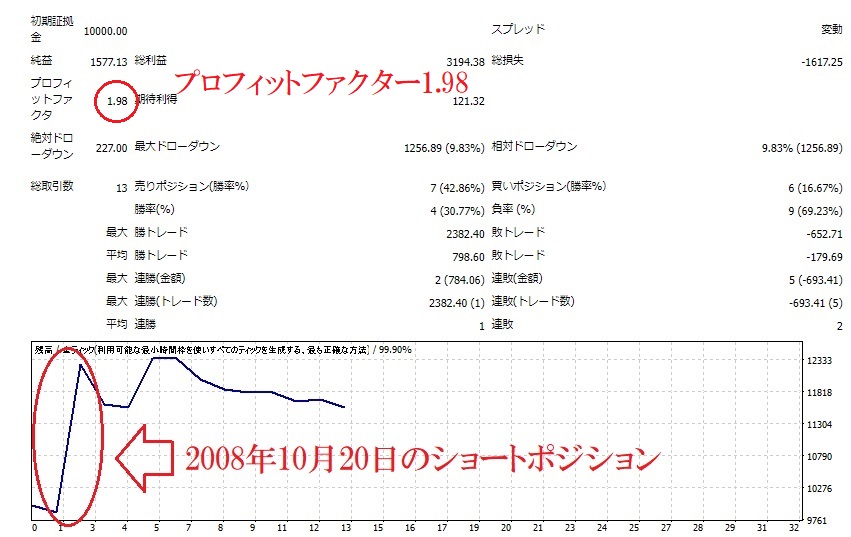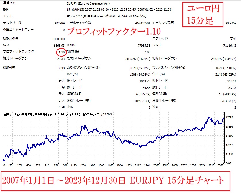 ユーロ円のバックテスト結果は、プロフィットファクター1.10です。