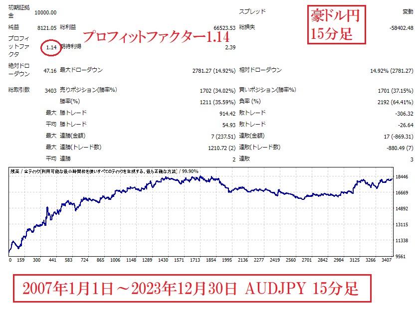 豪ドル円のバックテスト結果は、プロフィットファクター1.14です。