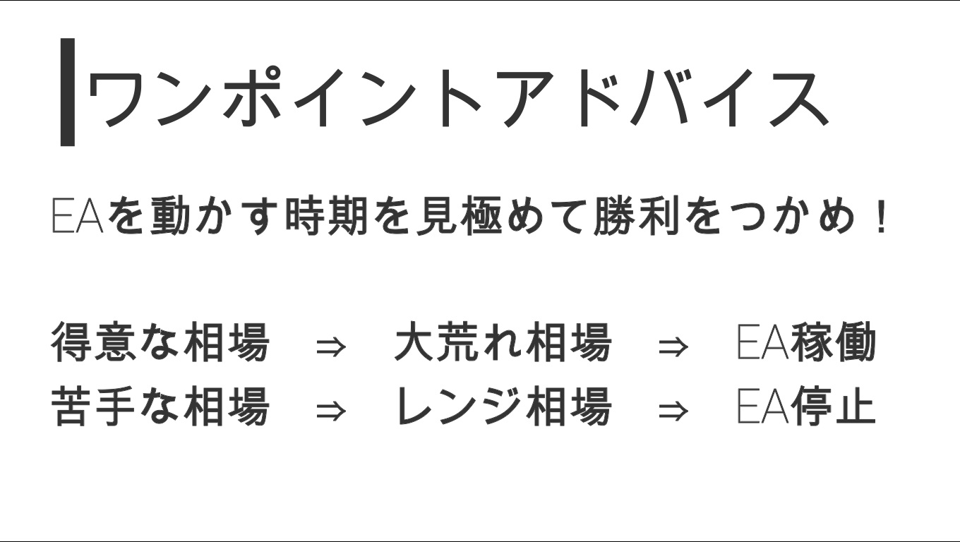 EAの取引タイプによって、順張りに向いている時期、逆張りに向いている時期などがあるため、すべての期間において成績が一定になることは少ないです。去年は良かったが、今年はあまり成績が振るわないということもあるため、運用する時期なのかどうかをある程度裁量で判断する必要があります。