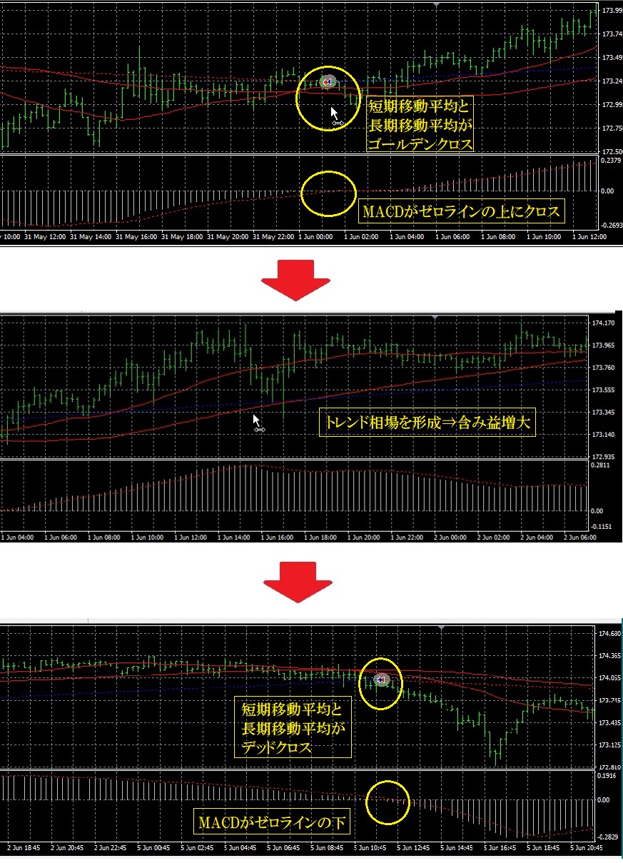 トレンド相場では短期MAの値と長期MAの値に着目し売買判定しています。