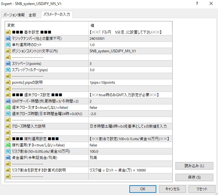 ●複利運用のリスク割合入力方式…資金1万円につき1000通貨の割合を100として入力する (計算式:リスク値 = ロット ÷ 資金(万) × 10000)