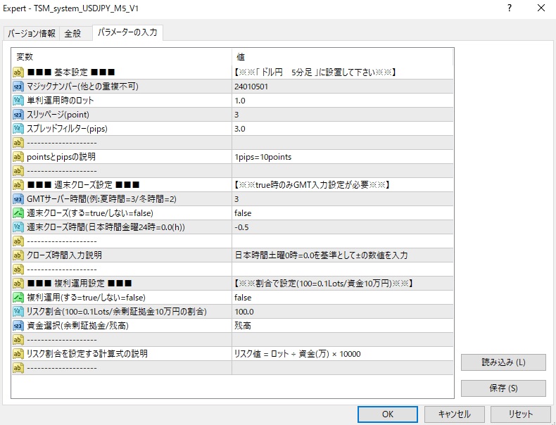 ●複利運用のリスク割合入力方式…資金1万円につき1000通貨の割合を100として入力する (計算式:リスク値 = ロット ÷ 資金(万) × 10000)