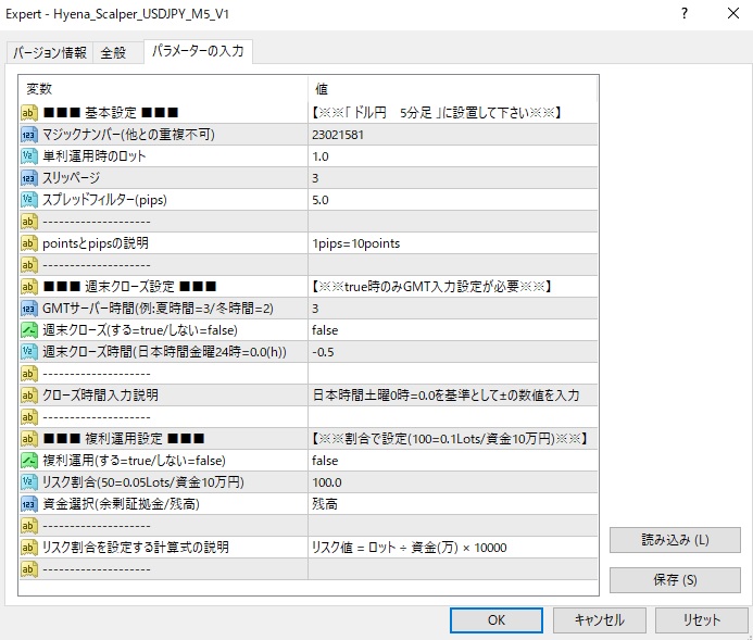 ●複利運用のリスク割合入力方式 …資金1万円につき1000通貨の割合を100として入力する (計算式:リスク値 = ロット ÷ 資金(万) × 10000)