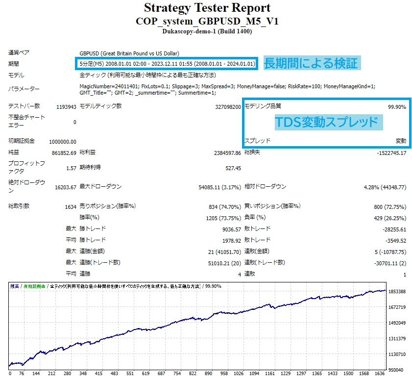 ●信頼性の高いと謳われるTDS変動スプレッドによる検証結果。  (1.5pips~10pips変動・スプレッドフィルター3pips)