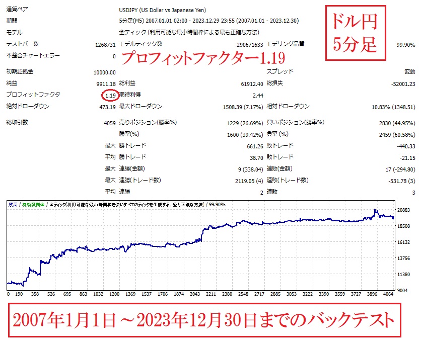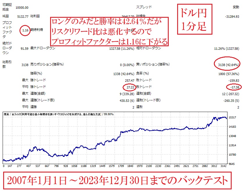 ドル円1分足でロング方向のみエントリーする設定でのバックテスト結果
